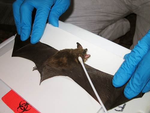 A northern myotis (Myotis septentrionalis) with suspected White Nose Syndrome is swabbed by Illinois Natural History Survey Mammalogist Dr. Joe Merritt while Joe Kath (Illinois Department of Natural Resources Endangered Species Manager/Bat Specialist) holds the animal. U.S. Fish and Wildlife Photo credit: University of Illinois/Steve Taylor