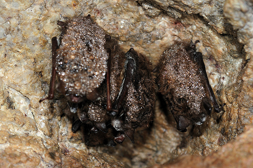 Cluster of Little Brown Bats with WNS. Photo Credit: Jonathan Mays, Wildlife Biologist, Maine Department of Inland Fisheries and Wildlife.