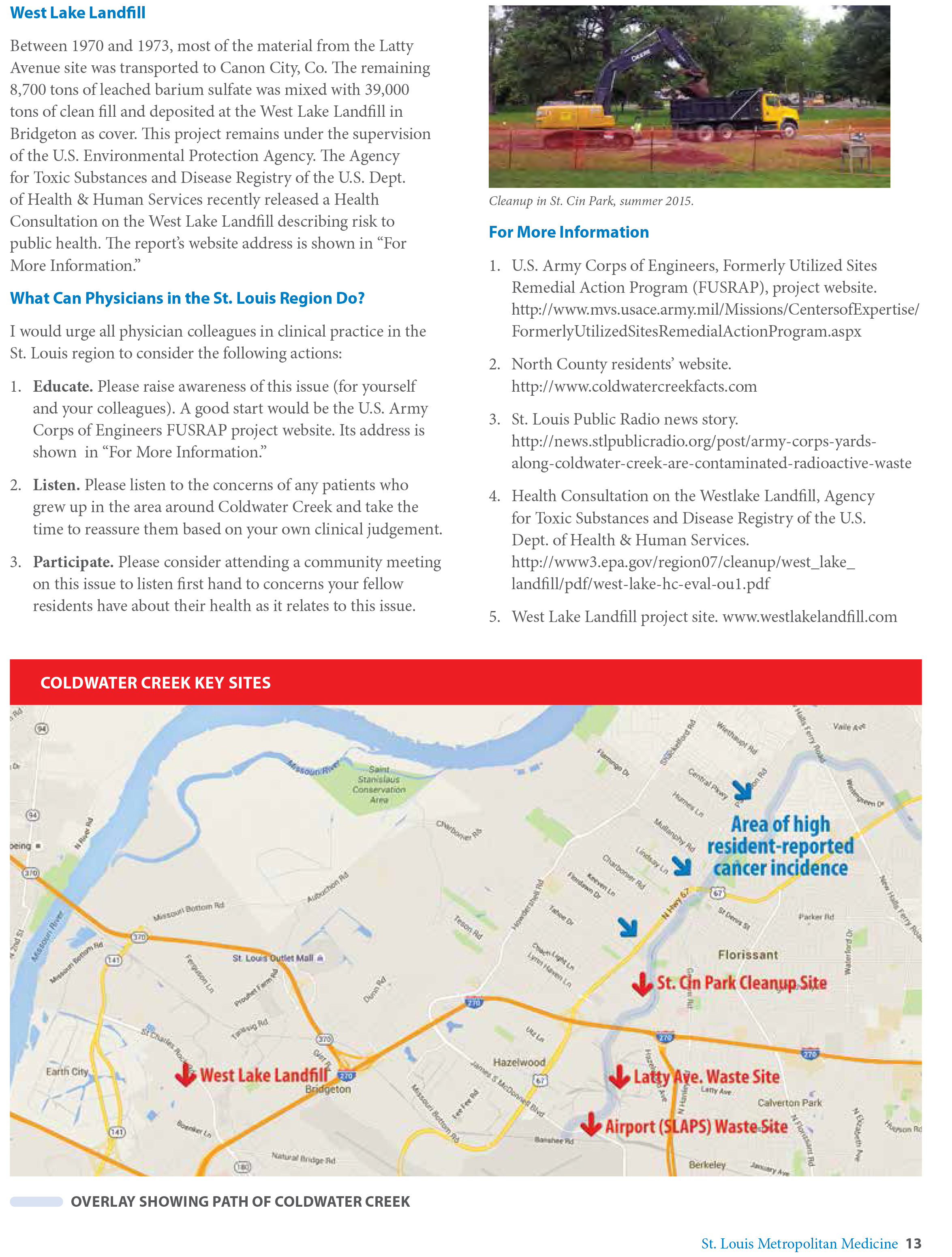 Cold Water Creek travels through North St. Louis County and drains into the Missouri River. The area surrounding the creek has been plagued with radioactive contamination for decades. Radioactive waste from the 1940s’ Manhattan Project atomic weapons program was buried near the creek headwaters, located adjacent to the Lambert St. Louis Airport, the original source of contamination in the area. Ongoing efforts to cleanup the contamination of the creek and surrounding area is being conducted by the U.S. Army Corps of Engineers.