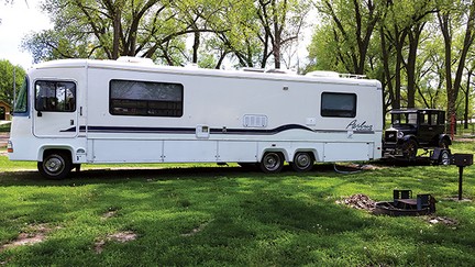 Steve and Diana Thum towed their Touring Model T on the back of a 1996 35-foot Rexhall Aerbus Recreational Vehicle (RV). They cut their Model T loose for drives at several stops along their way west. They parked the RV overnight for rack time in Walmart and Cabellas’ lots on the way to their destination in West Yellowstone.