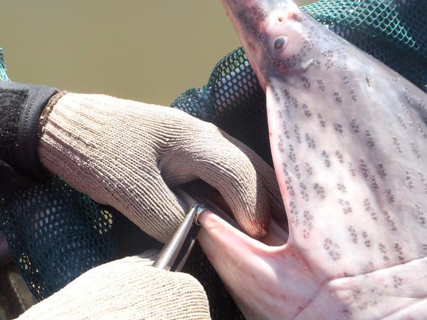 MDC is in its third year of a five-year tagging project to help monitor paddlefish numbers and improve species management. Department staff are placing metal jaw tags on up to 6,000 paddlefish netted in Lake of the Ozarks, Truman Lake, and Table Rock Lake and up to 1,000 netted from the Mississippi River. Photo by MDC Staff, courtesy Missouri Department of Conservation.