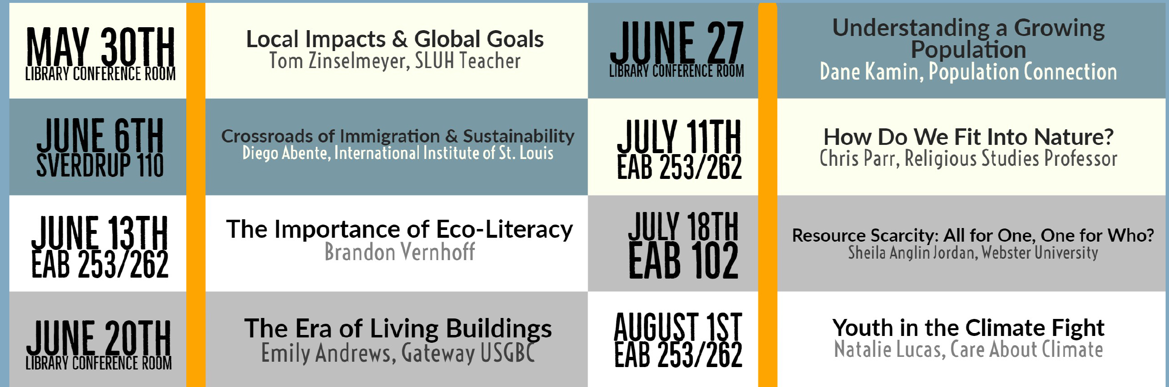 All sessions are held in on Webster University’s home campus in Webster Groves. Individual locations for each date can be found on the event website at webster.edu/sustainability. Please RSVP to help provide accurate attendance numbers. Parking is available in the Garden Park Plaza parking garage.