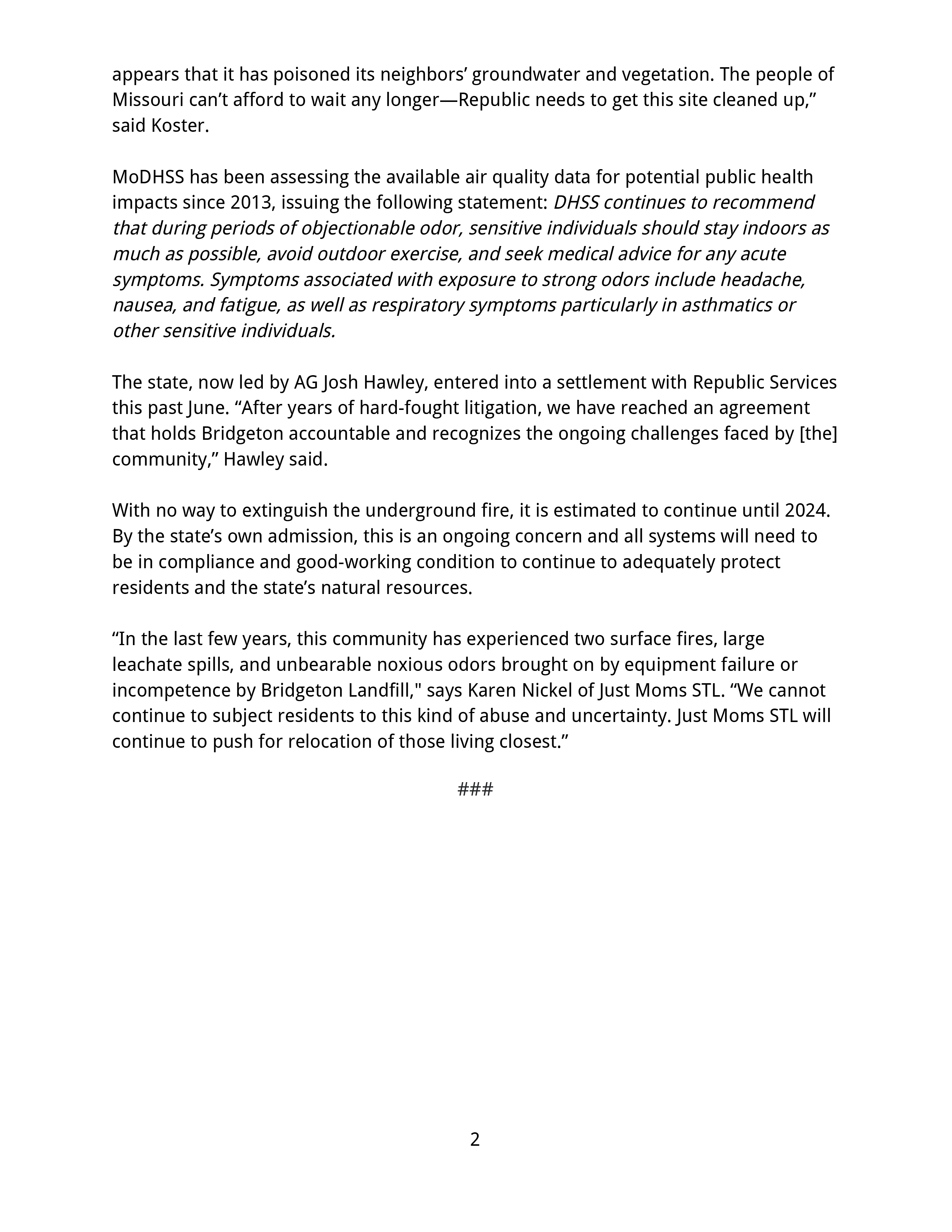 JUST MOMS STL: Update On Threat From Bridgeton Landfill Emissions