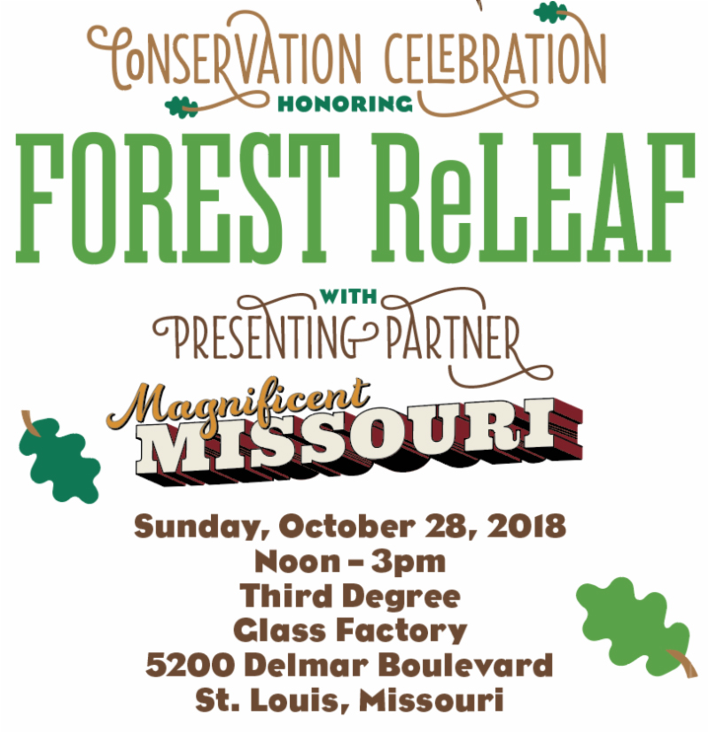 The Conservation Celebration, in partnership with Magnificent Missouri, honoring Forest ReLeaf on Sunday, October 28 from noon to 3pm at Third Degree Glass Factory.