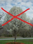 Native to China, callery pear limbs generally grow vertically, forming a pyramid or egg shape. In early April, very dense clusters of white flowers cover the tree before leaves form. In maturity, they reach heights of 30 to 40 feet. Property owners are encouraged to cut the trees during spring (when they are easy to identify) as a means to reducing populations from spreading in unwanted areas. Additionally, treating the stumps with herbicide is recommended.