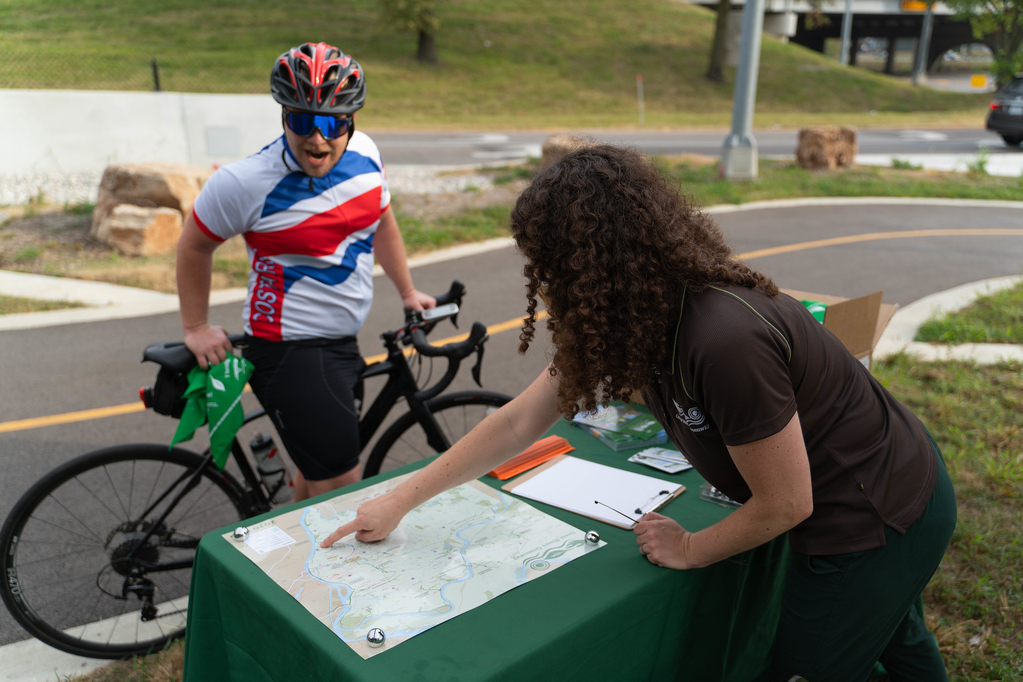On Saturday, trail users who crossed the bridge could collect souvenir water bottles, green cloth markers and bling from Emma Klues. She is the vice president of communications and outreach for Great Rivers Greenway.