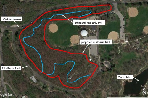Proposed; multi-use (cycling, running, walking (1+ mile), and cycling only (~1-mile) recreational trails in Kirkwood Park Forest.