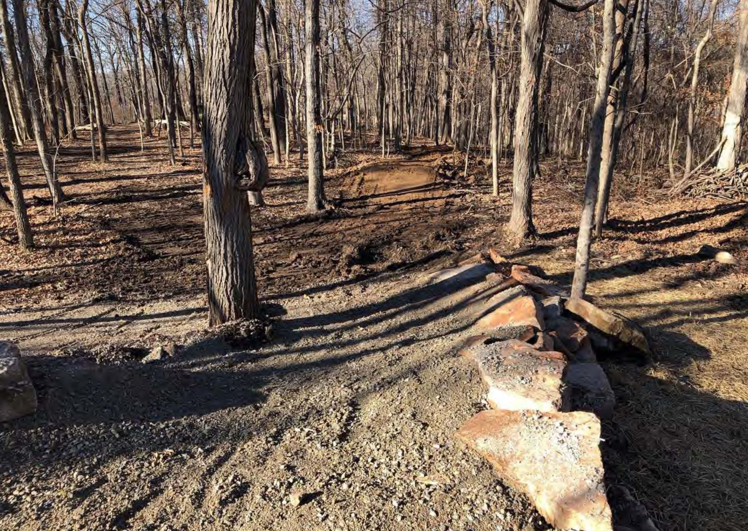 GORC (Gateway Off-Road Cyclists) bike trail with high ecological impacts, constructed in Bluff View/Rock Hollow Park, Wildwood, Missouri. These large bike “roads” fragment the forest, impacting plants and animals. Wildlife avoids the constant disturbance and some fauna will not cross the open barrier.