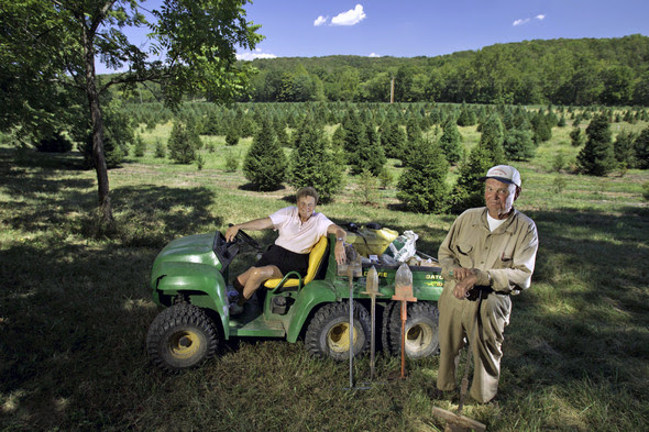 Domien and Eileen Meert at their Christmas tree farm near Festus, Mo. Domien holds the first tree dibble he ever used when he started his tree farm.