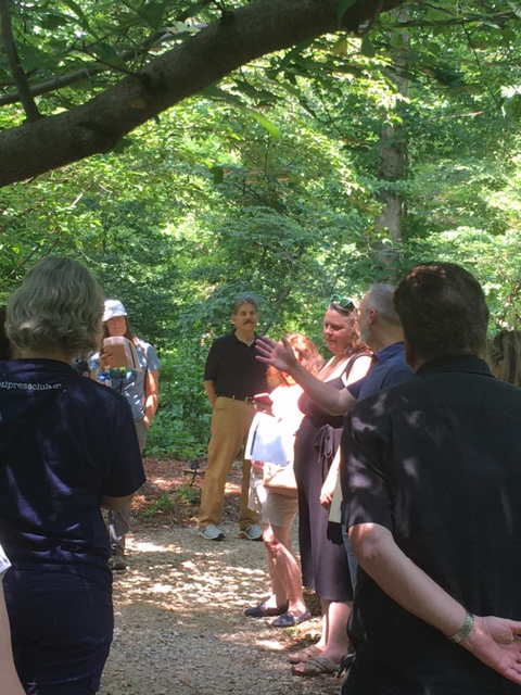 At the English Woodland Garden, Thornton read from Annie Dillard’s A Pilgrim at Tinker Creek, including this excerpt: “Water striders patrol the surface film, crayfish hump along the silt bottom eating filth, frogs shout and glare … ”
