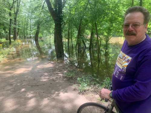 Environmental Echo’s Don Corrigan calls a halt to his bike ride on the GRG Trail near the border of Kirkwood and Valley Park as the Meramec River floods over the trail.