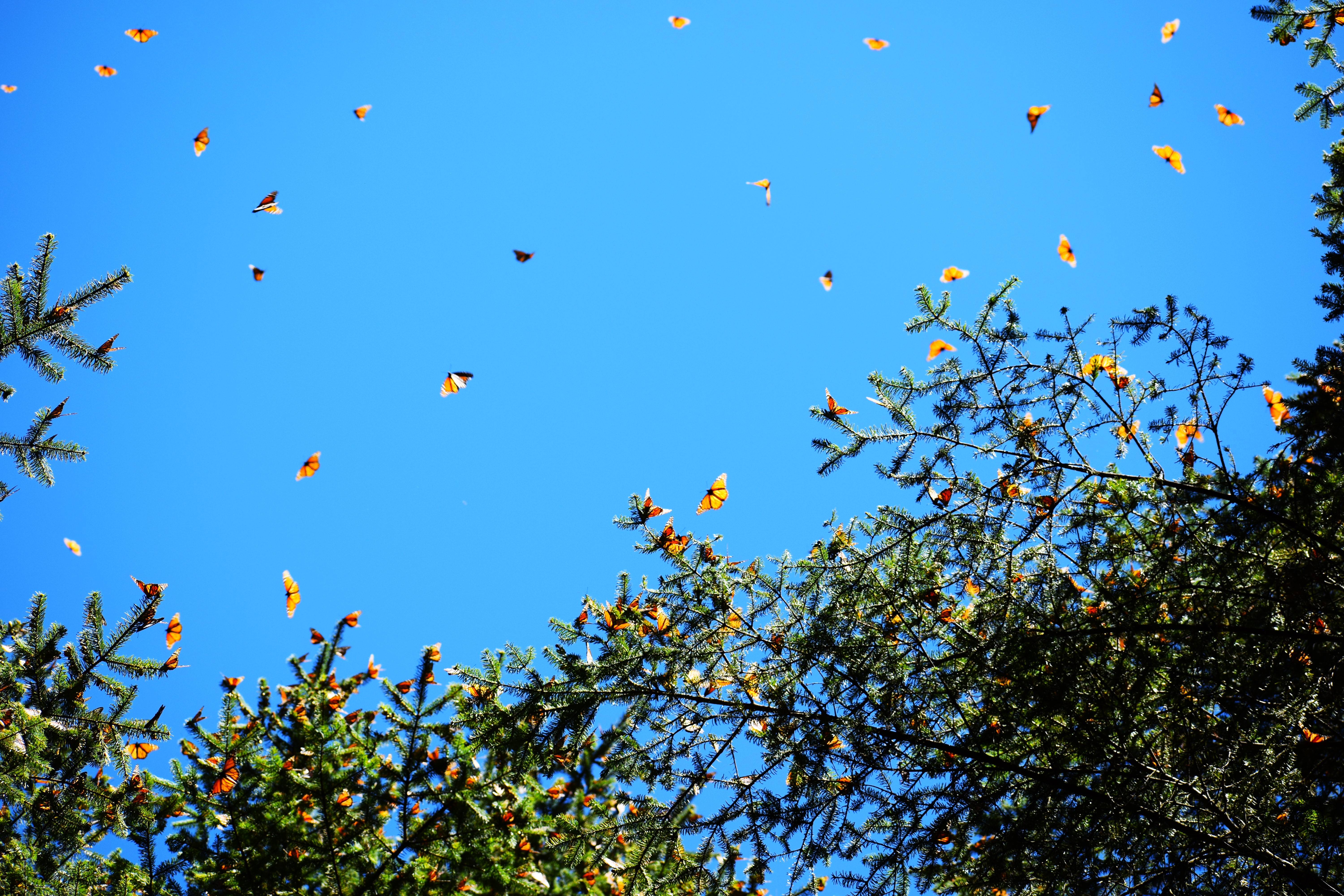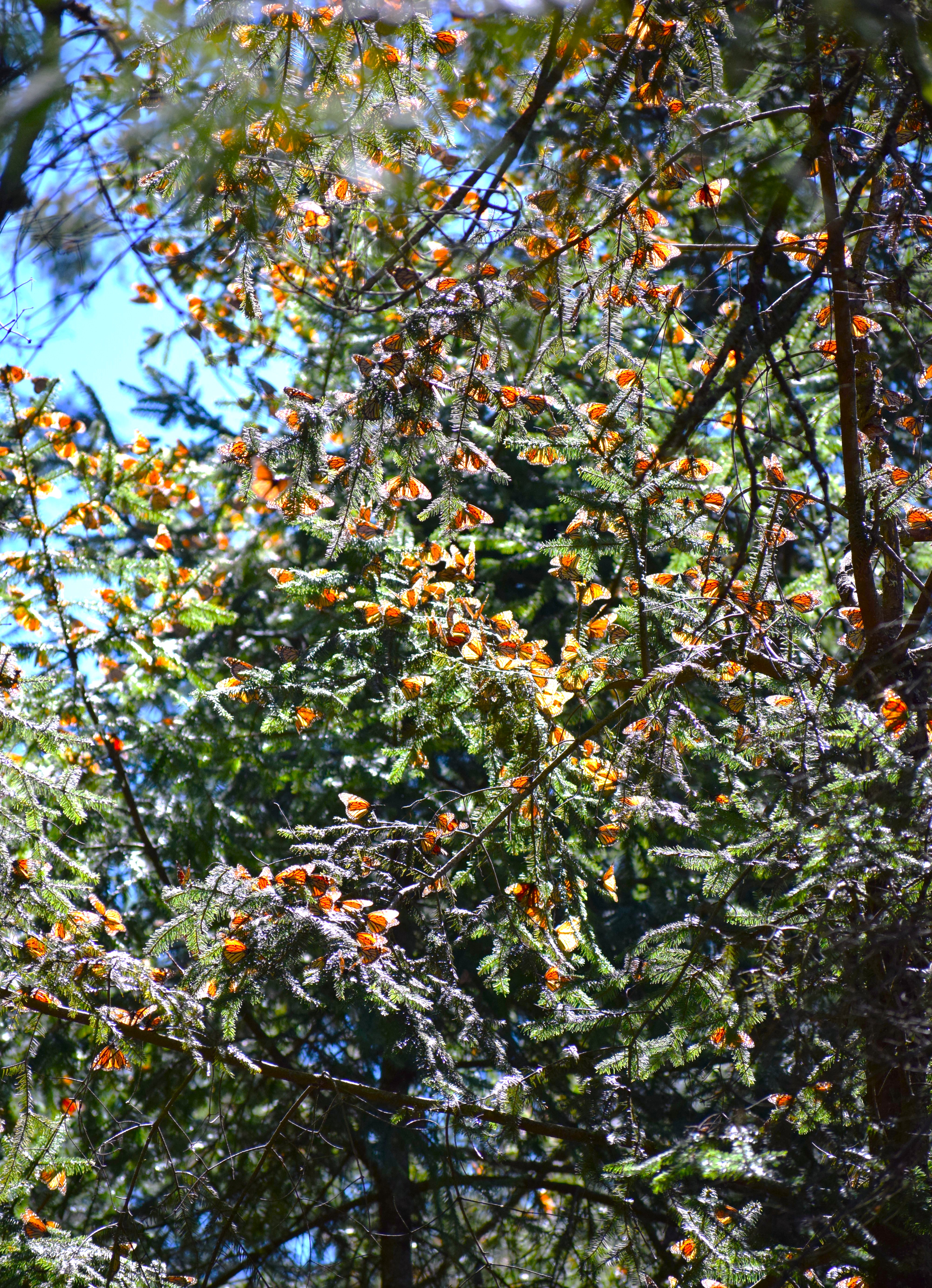 Monarch butterflies roost in the oyamel fir forests, which grow in a small mountainous area in central Mexico. Overwintering sites are two miles above sea level on steep, southwest-facing slopes.
