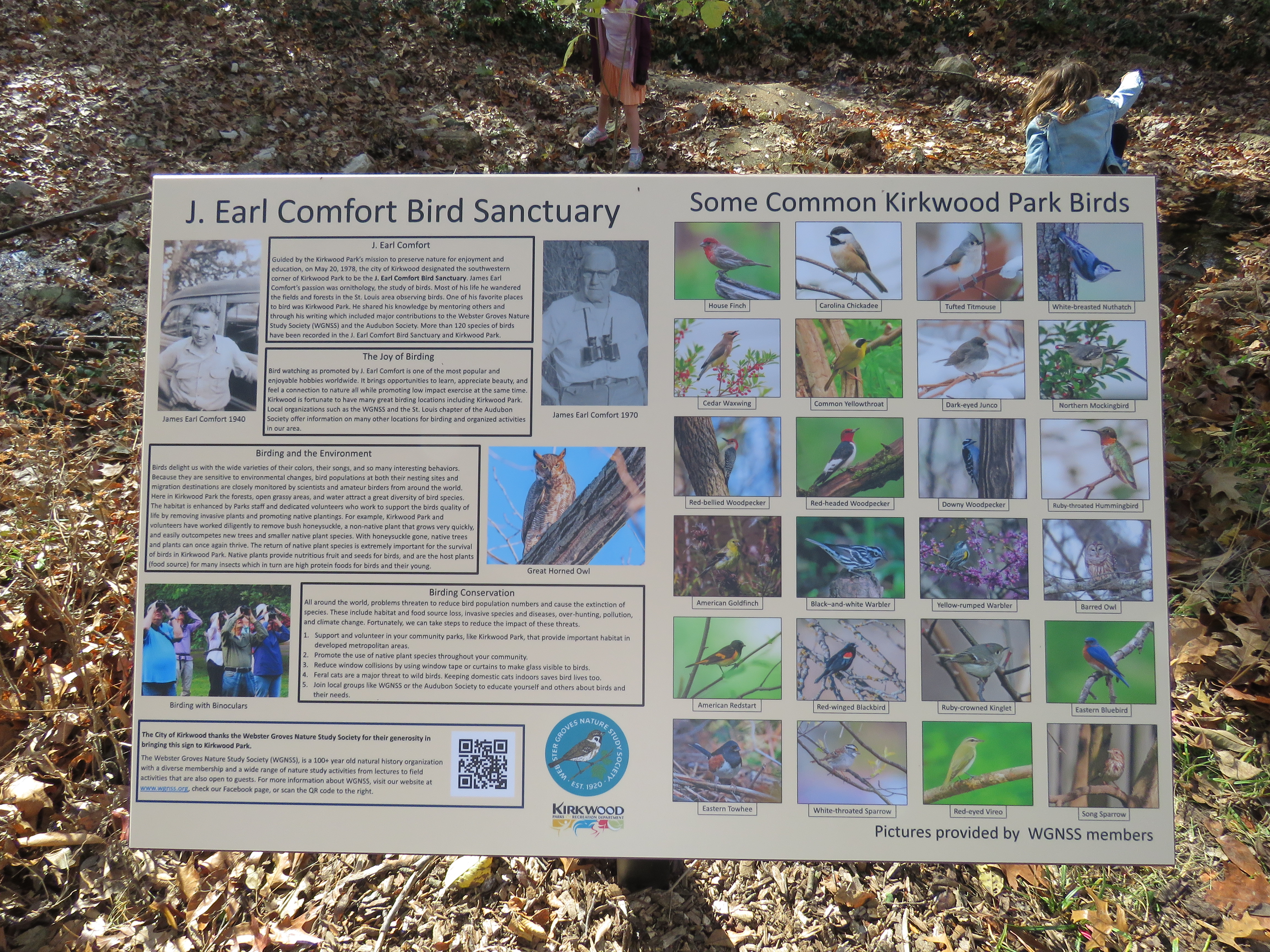 Saturday, Nov. 2, was a fine, sunny day to dedicate the new J. Earl Comfort Bird Sanctuary display in Kirkwood. A well-known St. Louis area birder, Comfort was a conservationist, educator and writer of bad bird puns.