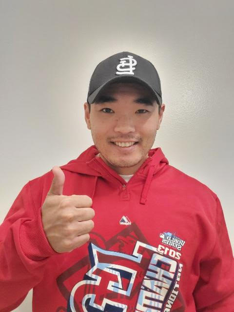 Cardinal Nation’s Kenny Chang, a 2008 Lindbergh High School grad in St. Louis, shows off some fan wear for the sustainable-conscious St. Louis Cards.